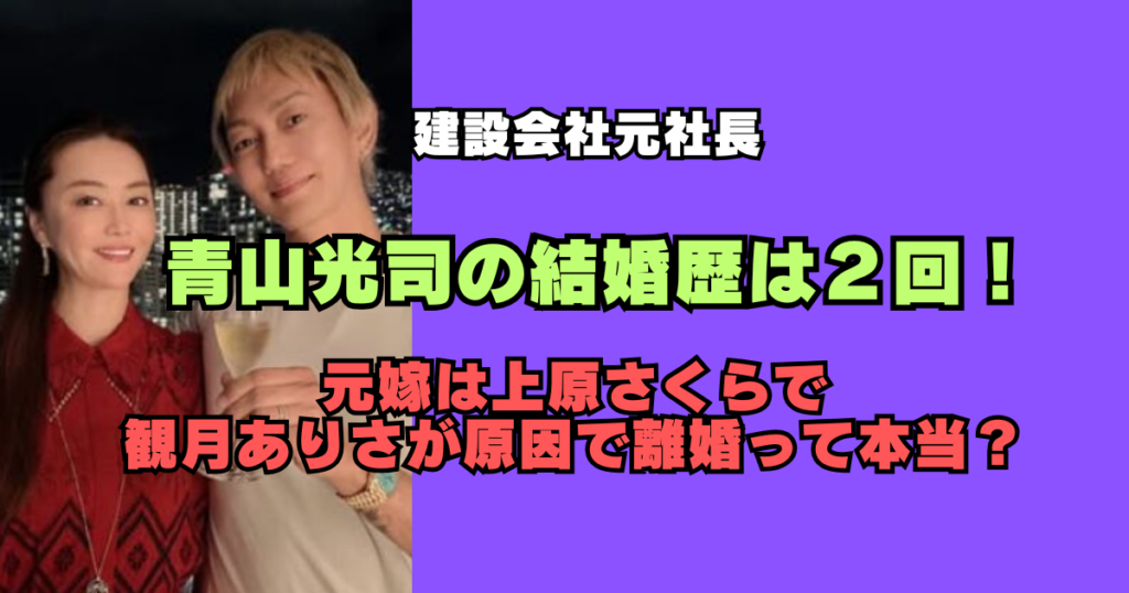 実業家の青山光司(あおやまこうじ)さんは女優や歌手、モデルとして長年活躍されている観月ありささんの夫としても有名です。実は青山さんは結婚歴が2回あって、元嫁も芸能人の方だったのはご存じですか?今回は建設会社社長の青山光司さんの前妻が誰なのか... -